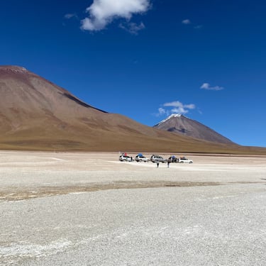 Day 3 - a super early 4am start, but that's because you have an hour drive to the salt flats for sunrise, which is hard to put into words honestly, you have to be there to experience it. It's a landscape that is so unique, you're just driving and walk on white, sparkly salt. We all had a simple but amazing breakfast of coffee, and some bread with jam and fruit, but the scenery was unbelievable and something I'll never forget. Then came the well-known photoshoot, where you use props, I used a toy dinosaur and a beer bottle. The last stop on the way to Uyuni is the train cemetery which was pretty cool, as you can imagine a bunch of deserted trains all parked in a desert parking lot.
