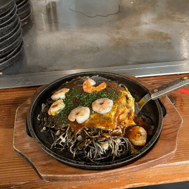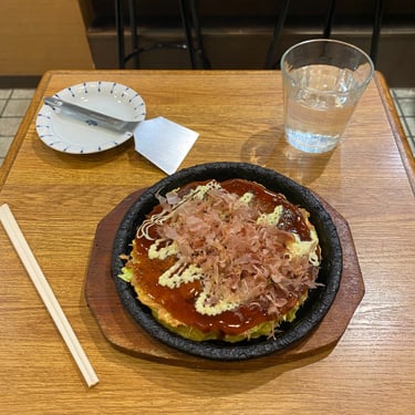 Okonomiyaki is a batter made of flour, water and vegetables mixed into it, and then you can choose pork of seafood to go into it, and it's essentially like a big pancake.