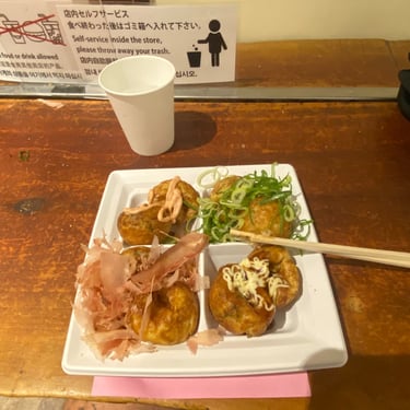 Takoyaki which is a snack, balls made up of flour, eggs, soup stock and filled with different fillings such as octopus, squid and more.