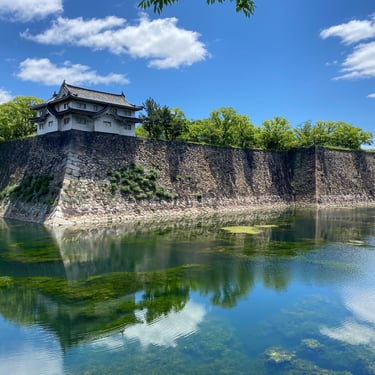 Osaka Castle - The grounds of this place on a sunny day are stunning, there is a moat that goes around it so it reflects off the water, up a massive stone wall, an impressive site.