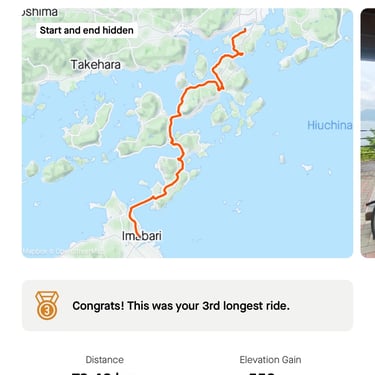 This is a unique bike route in Japan, between Osaka and Hiroshima. It is a number of very small fishing villages, that until recently were only connected via boat. They built 7 bridges connecting all of the islands, and in turn a great cycling route was formed where you simply follow the blue line all of the way, you can't get lost, and it's just a great experience seeing some rural Japan whilst also getting a good workout out, as it's 80km!