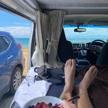 Firstly, Picton is a quaint little town, where you can watch the ferries come and go as it's the main link to the North Island, it has a lot of history because of this as well which is cool to learn about. This is only a 35km road, however it takes around 1.5 hours to drive without any stops, as it's incredibly windy and has a lot of undulation which slows you down in a big campervan. You actually want to drive as slowly as possible to take it all in, the scenes are absolutely incredible, it hugs the coastline and goes through a few little fishing villages which have nice areas to pull off in and grab some lunch. Another point is how good the food always was at these roadside cafes, no fast food joints like in the states, but local and family owned businesses. I stayed at Pelorus Bridge, which is an unpowered campsite down by a river, word of advice choose the number 14 pitch as it's super secluded and right by the river.