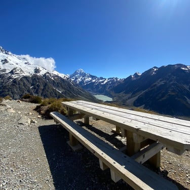 As you can imagine, it's pretty much all uphill, you start with a trail/steps built into the side of the mountain for about 1.5 hours, where you'll then reach a picturesque picnic table which is perfect to take your first proper rest. Some people only making it this far, as the next stretch is to try and summit up to the Mueller Hut which is around 3 hours, all uphill, having to traverse over rocks and loose gravel so it is a challenge.