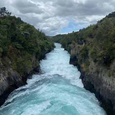 This is really impressive, just a 10 minute drive from town, it's the start of the Waikoto river, and it's where water leaves the lake through a narrow ravine, which in turns spits out 220,000 liters of water per second! It's super powerful, loud, some occasional water sprays and is good to view from above on the bridge, but also down at the mouth of it where it's a waterfall.
