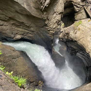Arguably the most famous village in the Bernese Oberland, as it's set in the most incredible valley, with mountains each side of it, waterfalls cascading down after it's rained or the snow melt run off, and lush green farms with picturesque Swiss huts. I walked around 5km from the town centre, to take in some of the scenery and I would recommend do that, as you'll be in awe. On the way back I stopped at Trummelback Falls which is a series of around 10 mini waterfalls that have been carved inside in the mountain, I say mini but the amount of water that flows through them is staggering, you can't hear yourself speak in some parts.
